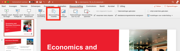 Open je Powerpoint presentatie in Microsoft Powerpoint en ga in de werkbalk naar “Diavoorstelling” en kies daar de optie “Diavoorstelling instellen”