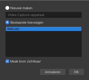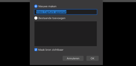 Er verschijnt een popup waarmee je deze bron een naam kan geven, in deze demo gaan we gebruik maken van de ingebouwde webcam van een Mac laptop.