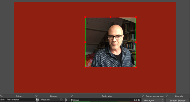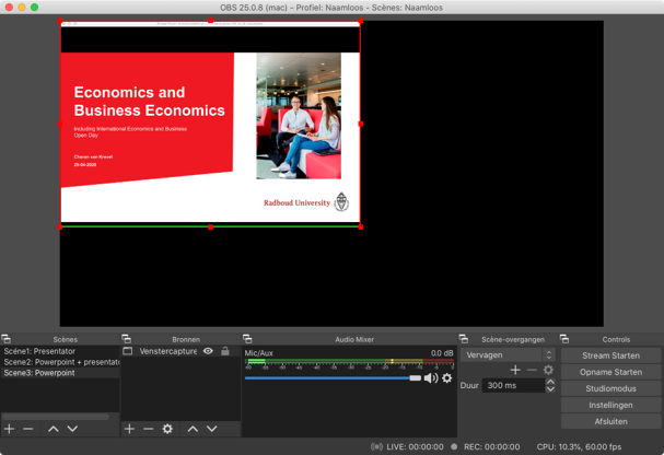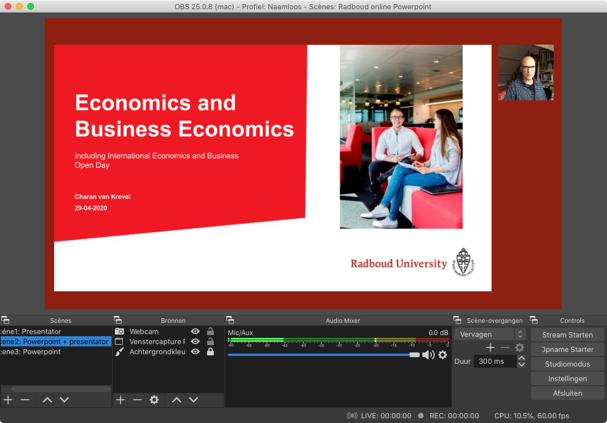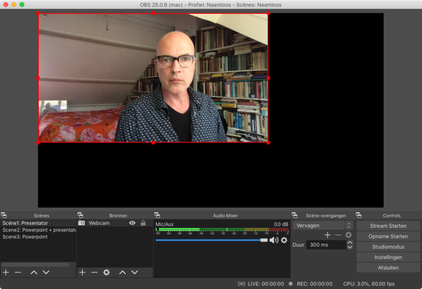 Je hebt nu 3 scènes die je afwisselend kan gebruiken om een interessante online presentatie te maken. Je kan eerst “droog oefenen” of al meteen een testopname maken. Het enige wat je hoeft te doen is rechtsonder op de knop “Opname starten” te klikken en de opname start meteen. Ben je klaar dan klik je op de knop “Opname stoppen”