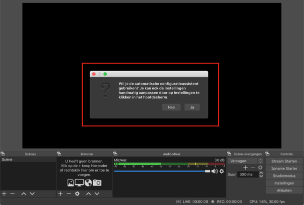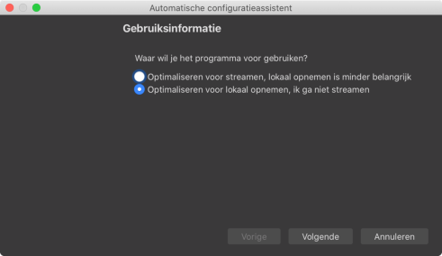 Als je OBS Studio na installatie de eerste keer opent zie je direct een pop-up, die je vraagt om de automatische configuratieassistent te gebruiken. Er wordt een wizard geopend die je met een paar stappen door de automatische configuratie leidt. Klik op “Ja” om deze te starten.