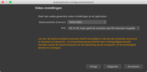 Kies, als dit nog niet gekozen is, bij Basisresolutie (Canvas) in de pulldown de optie “1920x1080”, dat is Full HD. Bij FPS (Frames Per Seconde) kan je de standaardwaarde laten staan, hier hoef je geen keuzes te maken. Klik vervolgens op de knop “Volgende”.