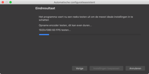 Op MacOS gaat OBS Studio nu testen wat je computer aankan. Dit kan enige tijd duren. Op Windows lijkt deze test niet altijd plaats te vinden. Kijk dan onder FAQ onderaan deze handleiding wat je kunt doen.