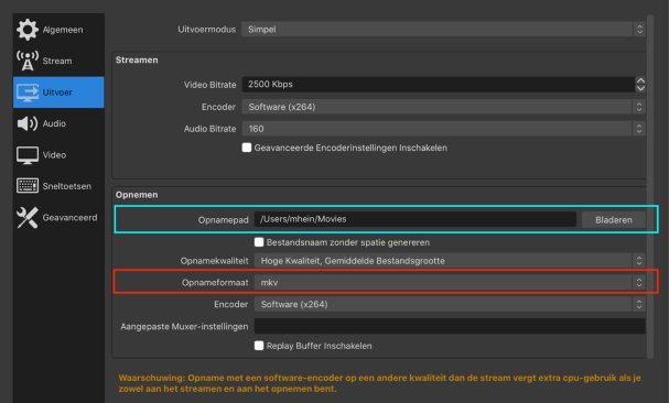 Zorg op Windows voor de meest actuele videodrivers en kies voor “Hardware (NVENC)”. Als dat niet werkt kan altijd “Software (x264)” worden gekozen, maar dit kan op minder krachtige computers misschien te zwaar zijn.