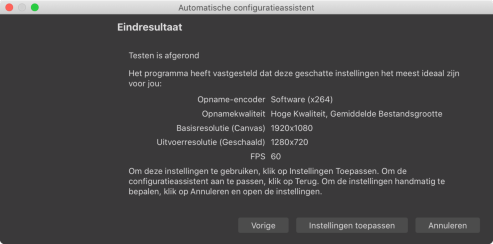 Als OBS Studio klaar is met de test komt deze met de optimale settings voor jouw computer. Klik vervolgens op de knop “Instellingen toepassen” om deze settings te accepteren.