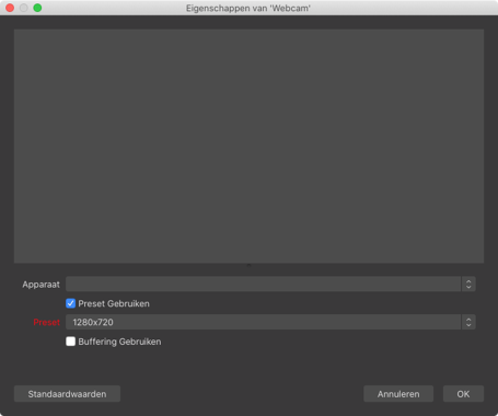 Let op! Ook wanneer de (web)cam in andere applicaties goed werkt kan een verkeerde instelling zorgen voor haperend beeld of geluid bij OBS. Als je dit opmerkt, zet dan de webcaminstellingen op ‘standaard’ (dit hangt af van het merk en model) en zorg dat de webcam is aangesloten op een eigen, USB 2.0 of 3.0 poort, niet via een USB Hub.