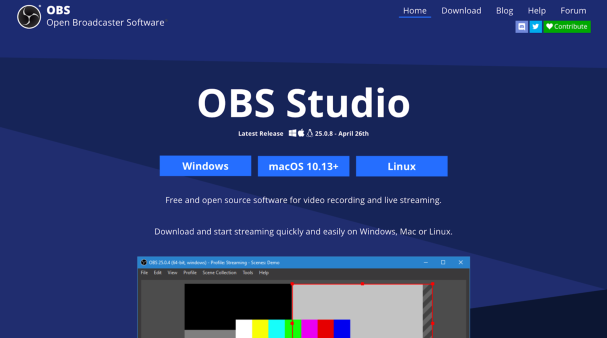 Deze handleiding behandelt het gebruik van OBS Studio, dat is gratis software voor opnemen en streamen beschikbaar voor Windows, MacOS en Linux. Je kunt OBS Studio downloaden op https://obsproject.com/, de website detecteert direct welk besturingssysteem je hebt (Windows, MacOS) en biedt je meteen de juiste downloads aan.