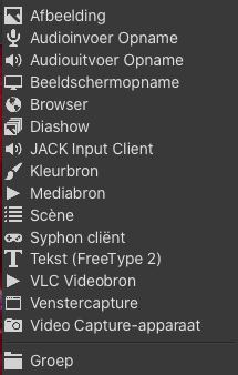 Selecteer Scene1 en klik bij Bronnen (direct naast scènes) op het “+” plusje om een bron toe te voegen aan de eerste scène. Je hebt veel mogelijkheden die we niet allemaal in deze Getting Started gaan behandelen.