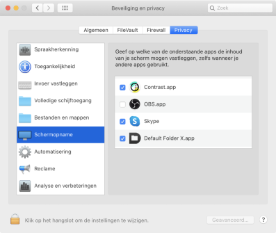 Vanaf macOS 10.15 Catalina moet elk programma permissie hebben van het systeem voor het vastleggen van beeld, cameras, and geluid. Soms slaat een programma deze stap over en heeft het nog geen toestemming van het systeem.